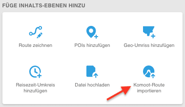 Wählen Sie dazu im Reiter „Inhalte hinzufügen“ den Punkt „Komoot-Route importieren“: